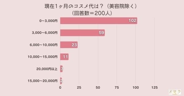 「現在1ヶ月のコスメ代は?(美容院除く)」とアンケート調査した結果、1位は『0~3,000円』でした。