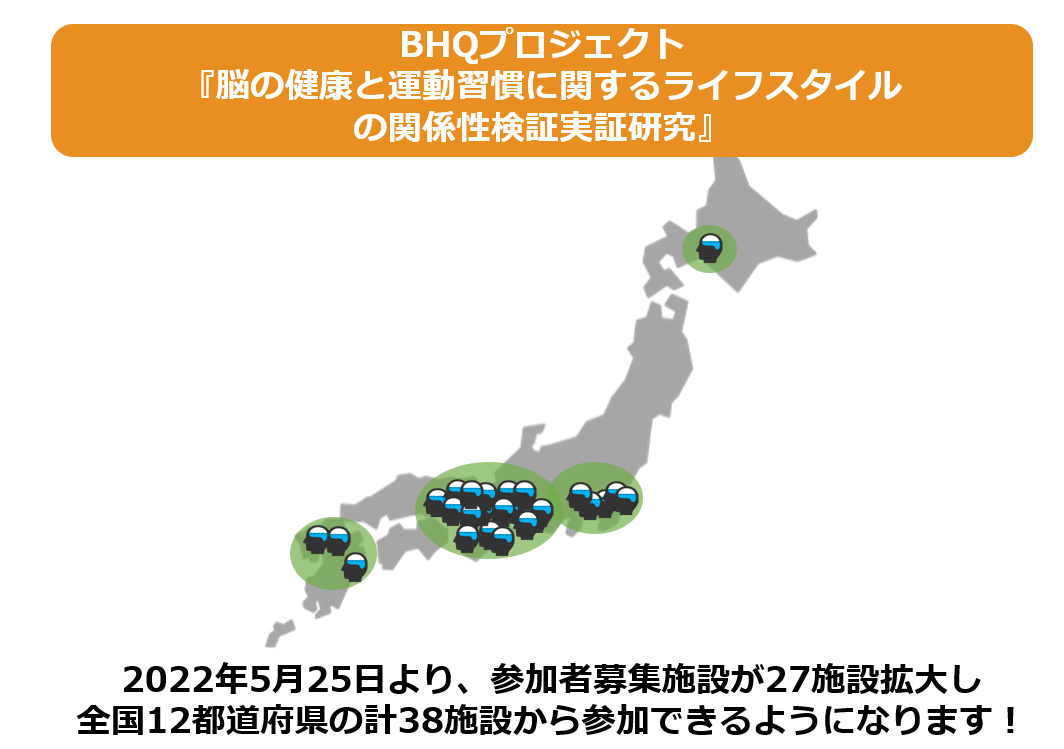 4月21日よりブレインインパクトのBHQプロジェクト*1が推進している本実証研究について、5月25日よりアクトス(一部対象店舗)および、いきいきランド交野でも実証参加者の募集にご協力いただくことが決定いたしました。これにより、本研究について全国12都道府県、38施設から参加できるようになりました。
