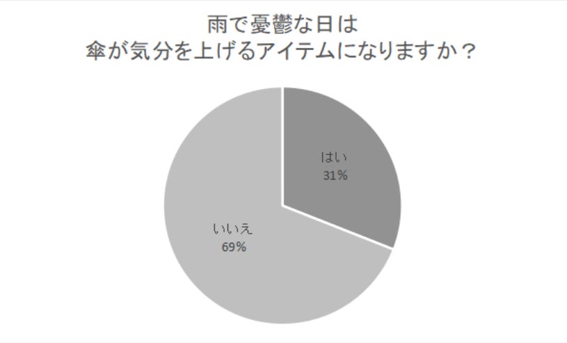 「はい」と答えた人は31%で、「いいえ」と答えた人は69%でした。この結果を見ると、憂鬱な雨の日にお気に入りの傘を持って行っても気分を上げることはあまりないようです。
