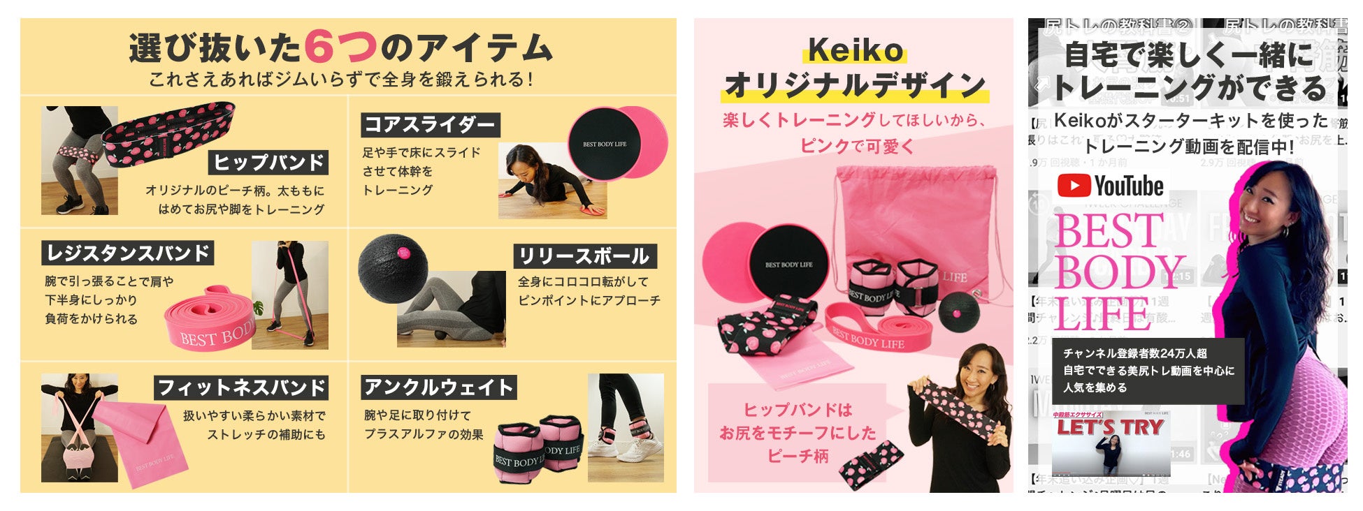 – 正しい動きが分かるトレーニング動画が視聴可能:Keiko氏のYouTubeチャンネルにてスターターキットを使ったトレーニング動画を順次公開。ダイエットに挑戦したい方や筋トレがなかなか続かない方でも、動画を視聴しながら正しい動きで楽しくトレーニングを続けられます。