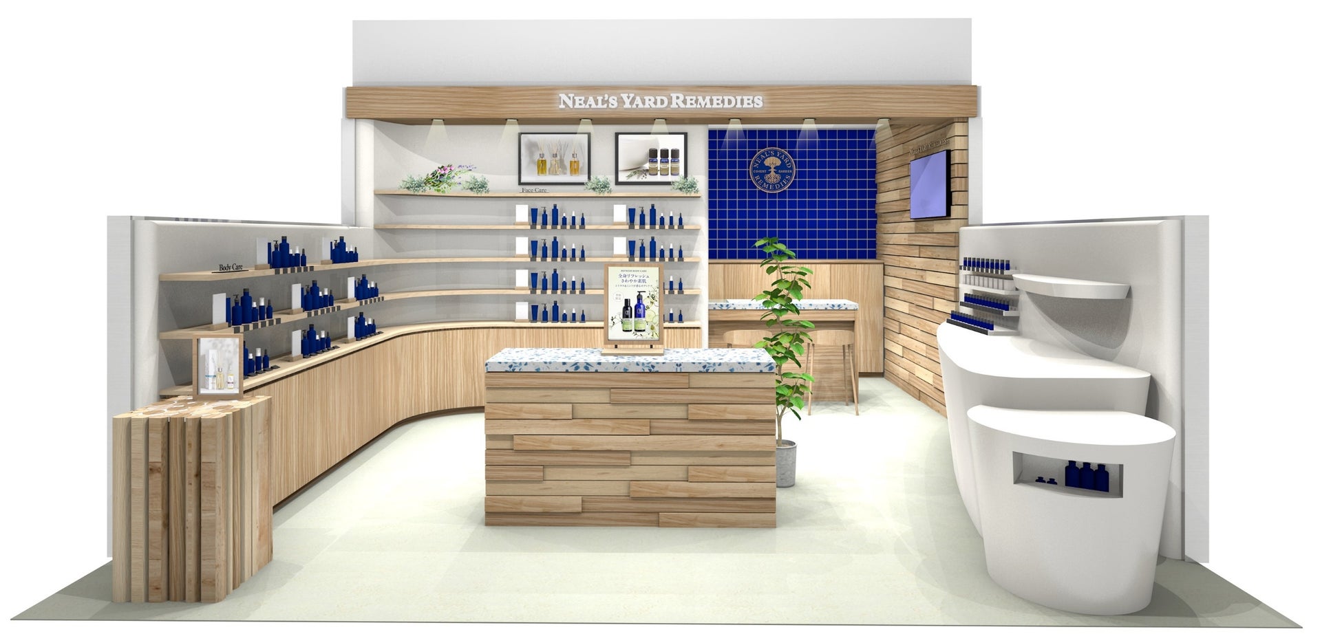 福岡天神大丸店舗では、ニールズヤードを象徴するブルーボトルをアップサイクルしたカウンターや、奈良県吉野の間伐材を利用した店内の什器を採用。サスティナブルな空間で、ご来店いただいたお客様の心が浄化されるような店舗づくりを行っています。