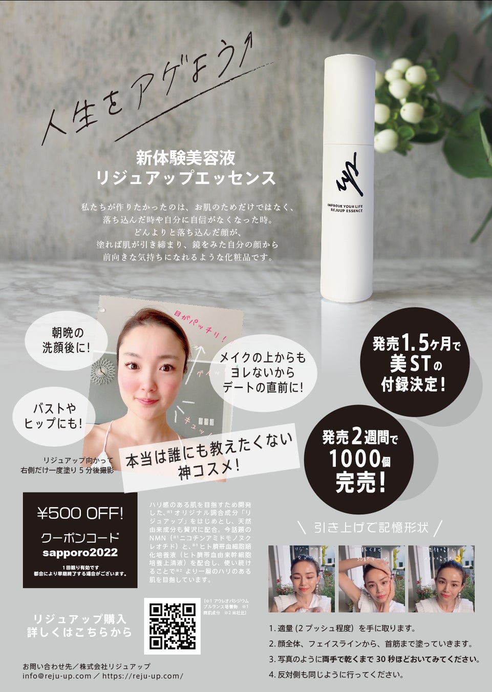 「人生をアゲよう↑」をミッションに最新の抗加齢医学領域の2大トレンド成分であるNMN x ヒト幹細胞入り新体験美容液、『リジュアップエッセンス』を提供する株式会社リジュアップ(https://reju-up.com/ 本社所在地:東京都目黒区)は、2022年5月29日(日)14:00開演予定の北海道最大のファッションイベント『Kuu Prezents SAPPORO COLLECTION 2022 SPRING/SUMMER』(主催:札幌コレクション実行委員会)に協賛スポンサーとして初登場します。