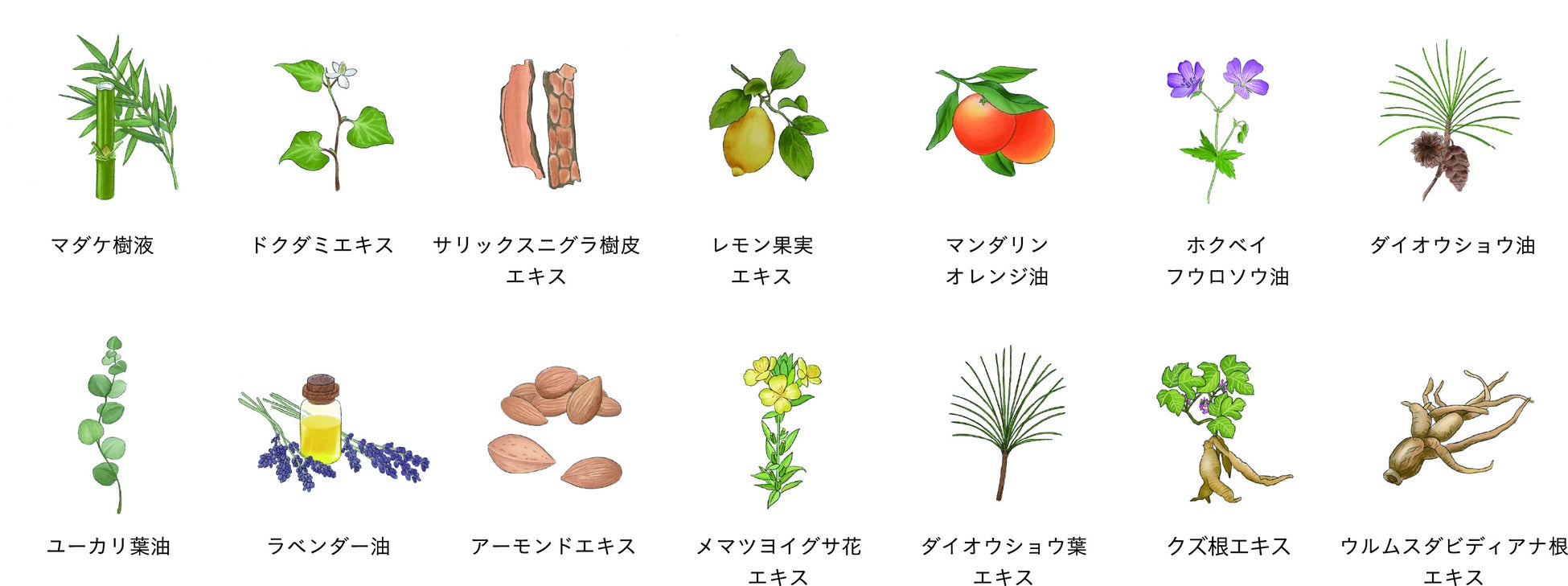 マダケ樹液、ドクダミエキス、水、BG、1,2-ヘキサンジオール、グリセリン、サリックスニグラ樹皮エキス、レモン果実エキス、マンダリンオレンジ油、ホクベイフウロソウ油、ダイオウショウ油、ユーカリ葉油、ラベンダー油、アーモンドエキス、メマツヨイグサ花エキス、ダイオウショウ葉エキス、クズ根エキス、ウルムスダビディアナ根エキス、(アクリロイルジメチルタウリンアンモニウム/VP)コポリマー、ラウリン酸ポリグリセリル-10、ミリスチン酸ポリグリセリル-10、エチルヘキシルグリセリン、EDTA-2Na