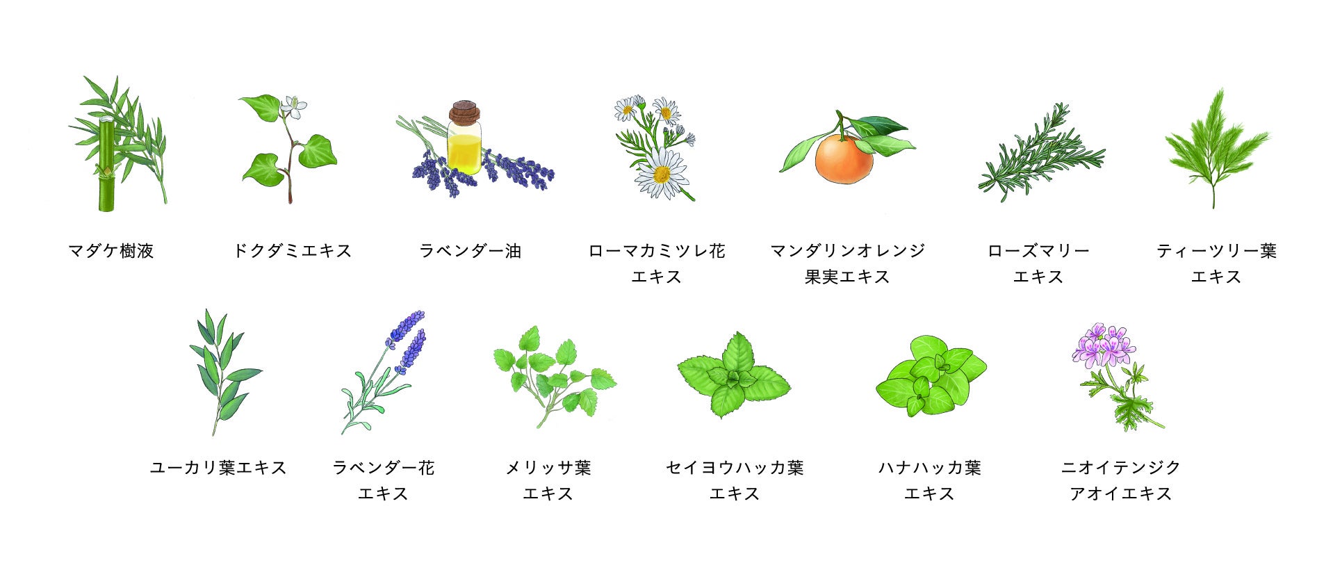 水、グリセリン、マダケ樹液、BG、ドクダミエキス、フェニルトリメチコン、1,2-ヘキサンジオール、ラベンダー油、ローマカミツレ花エキス、マンダリンオレンジ果実エキス、ローズマリーエキス、加水分解クチナシエキス、ティーツリー葉エキス、ユーカリ葉エキス、ラベンダー花エキス、メリッサ葉エキス、セイヨウハッカ葉エキス、ハナハッカ葉エキス、ニオイテンジクアオイエキス、(アクリレーツ/アクリル酸アルキル(C10-30))クロスポリマー、ベヘニルアルコール、(アクリル酸ヒドロキシエチル/アクリロイルジメチルタウリンNa)コポリマー、アルギニン、エチルヘキシルグリセリン、キサンタンガム、(アクリロイルジメチルタウリンアンモニウム/メタクリル酸ベヘネス-25)クロスポリマー、EDTA-2Na、イソステアリン酸ソルビタン、トレハロース、マルトデキストリン