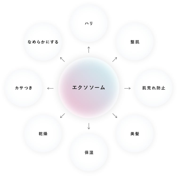 エクソソームは培養中の細胞から分泌される⼩さなカプセルです。このカプセルは肌に必要な働きを含み、⾓層のすみずみを移動することで各所に必要な成分を届けます。