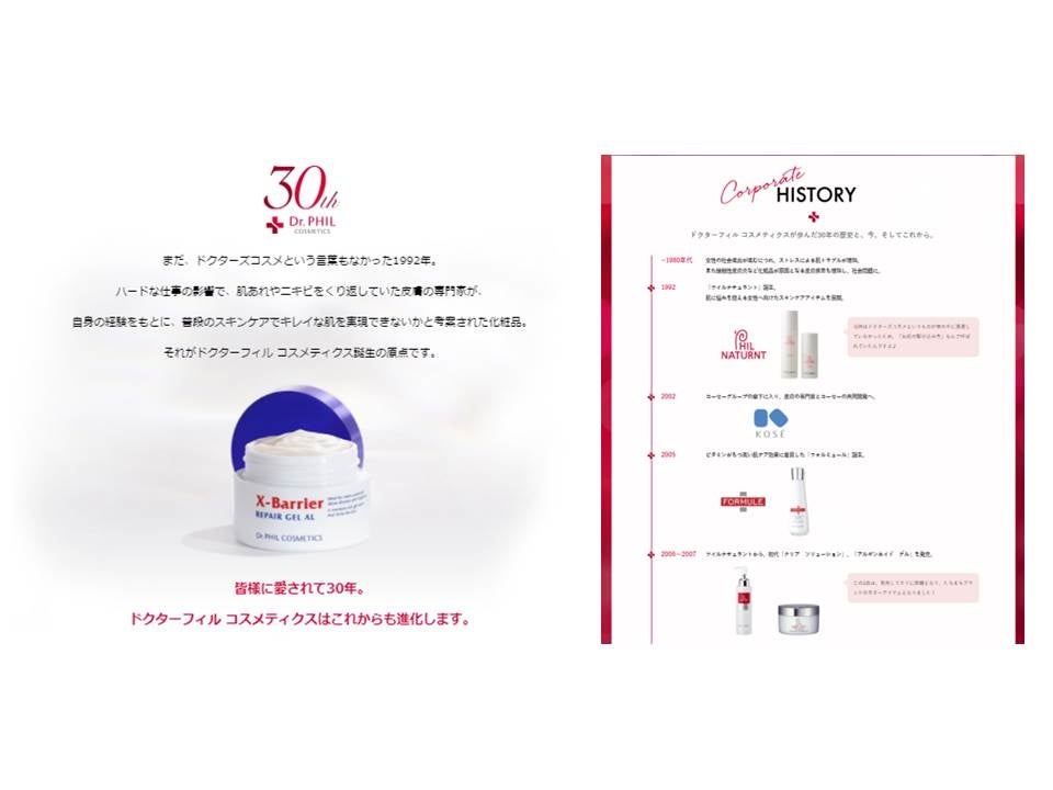 株式会社ドクターフィル コスメティクス(本社:東京都中央区 株式会社コーセー100%出資、代表取締役:山田 育宏)は、2022年に創業30周年を迎えるにあたり、長年のご愛顧に対する感謝を込めて、2022年5月から2023年4月まで、公式通販やドクターフィルコスメティクス取扱店の店頭で、30周年記念企画をさまざまな形で実施します。その一環として、5月27日(金)より公式ホームページ内に特設サイトを開設し、30周年記念スペシャルコンテンツを掲載します。
