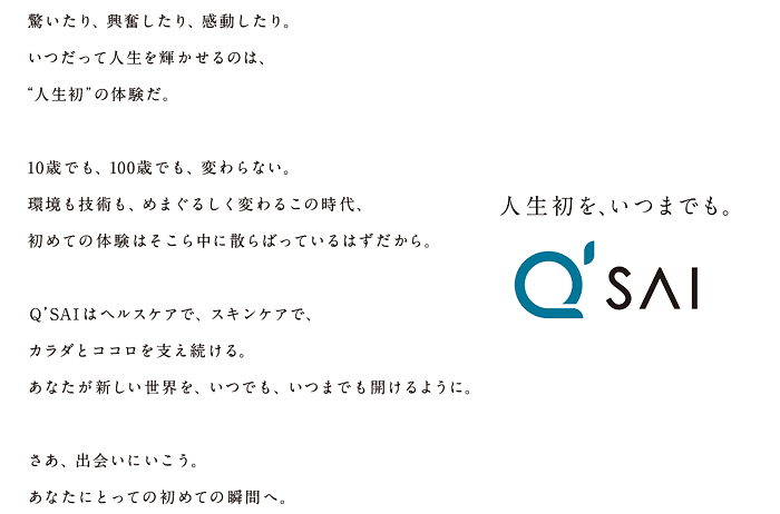 キューサイは、年齢を重ねることを前向きに捉えられる世の中の実現に向けてヘルスケアで、スキンケアで、お客さまの“人生初”を応援します。
