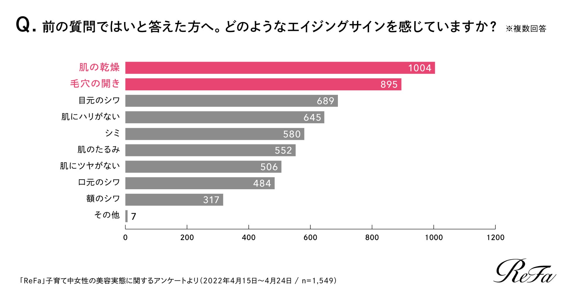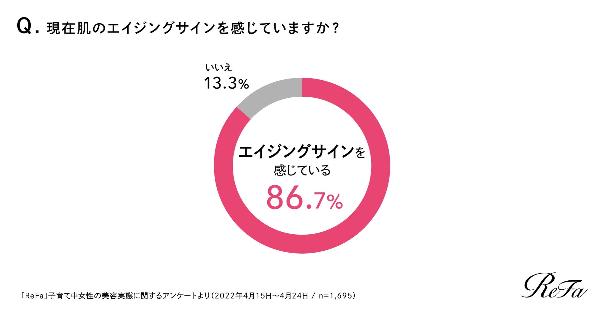 株式会社MTG(本社:愛知県名古屋市、代表取締役社長:松下剛)が展開する、ビューティーブランド『ReFa(リファ)』は、子育て中の女性を対象に、美容に関する実態調査を実施いたしました。調査の結果、子育て中の女性1695人のうち、86.7%が肌のエイジングサインを感じているにもかかわらず、本来ならばすぐにケアしたいはずのバスタイム直後すぐにスキンケアができないことが多く、手早く済ませる傾向にあることもわかりました。「ちゃんとしたいのに、ちゃんとできない…」「でも、自由に使える時間があるならとにかく寝たい!何もしたくない!」…、そんな、ママの本音まで明らかになった調査結果を公開いたしました。