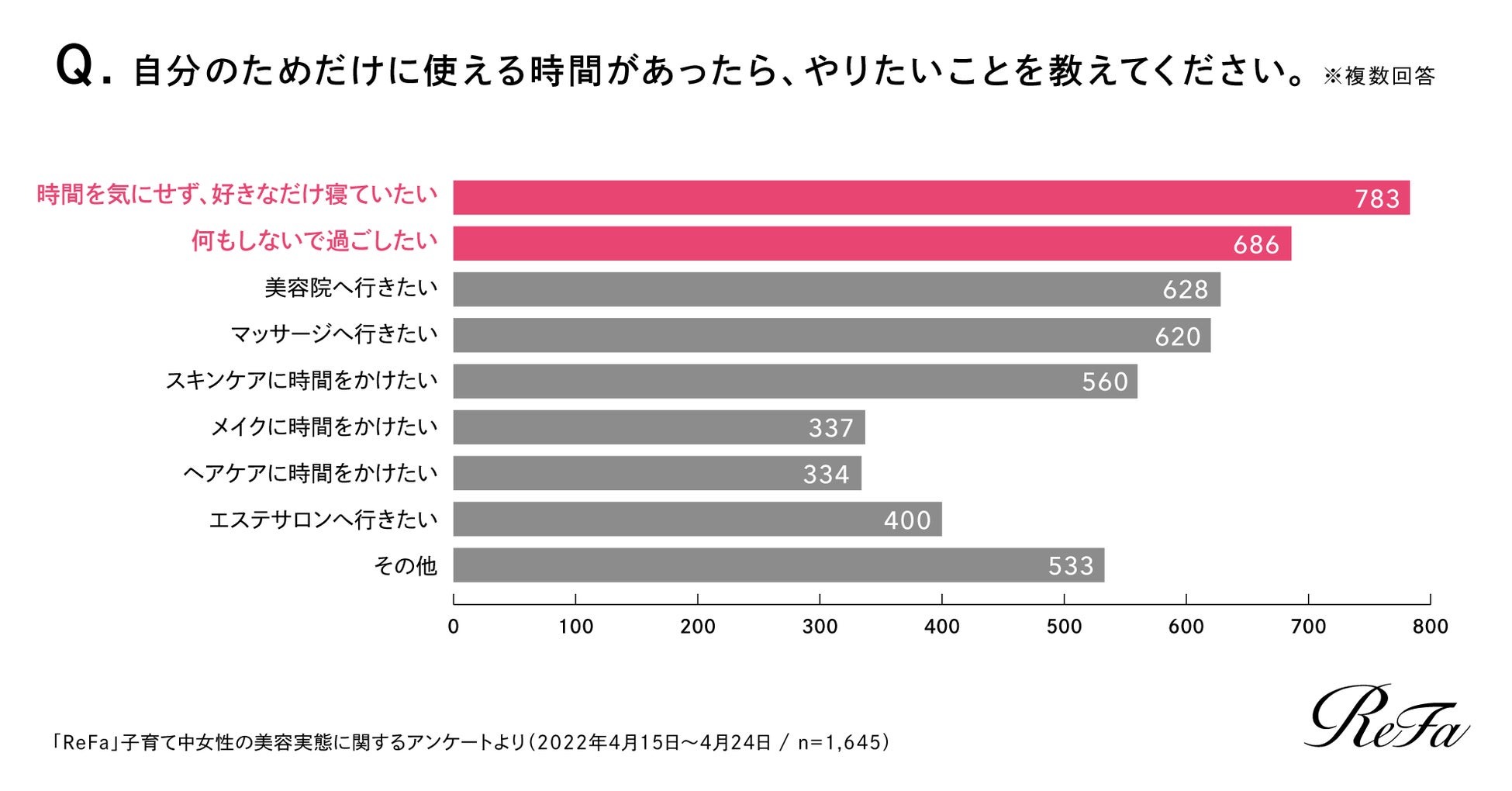 働くママたちに、自分のためだけに自由に使える時間があるなら何をしたいかを尋ねたところ、「時間を気にせず好きなだけ寝たい」が47.6%、「何もしないで過ごしたい」が41.7%という結果に。スキンケアやヘアケアなどの美容ケアを大きく上回り、「貴重な時間は、心や身体を休めるために使いたい」というママたちの本音が明らかになりました。