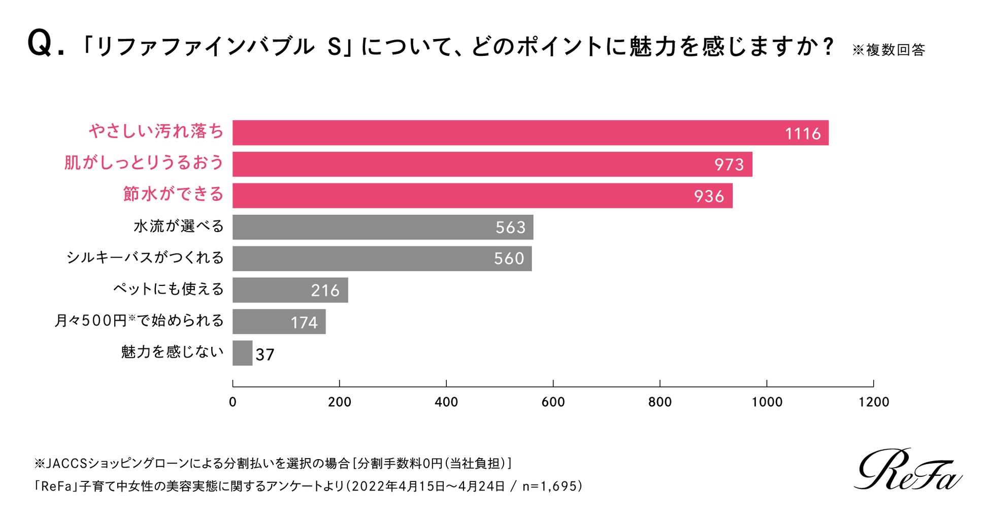 リファファインバブル Sについて、ママが1番魅力に感じるポイントは、「やさしい汚れ落ち」で65.8%。続いて「肌がしっとりうるおう」が57.4%で、「節水できる」の55.2%をやや上回る結果でした。