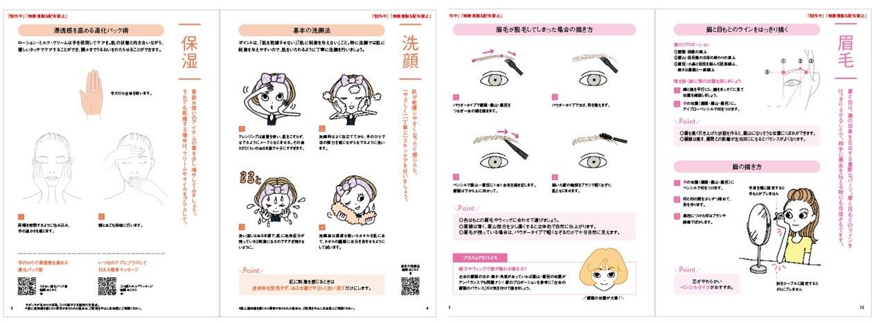 今回のスキンケア・メークのアドバイス冊子は、乳がん罹患者の方たちに、自身の肌や心の変化と向き合いながらお手入れをすることで豊かな時間を過ごしていただけるように、また、メークをすることで前向きな気持ちになったり、新しい自分を発見して元気になっていただくきっかけになるようにと願い、ポーラがオリジナルで制作しました。洗顔・保湿・UVケア等の基本から気をつけるべきポイント、イキイキと明るい印象に見せるメーク、眉毛が脱毛した場合のアイブローの描き方や帽子・ウィッグに合わせる方法などもイラストとともにご紹介しています。
