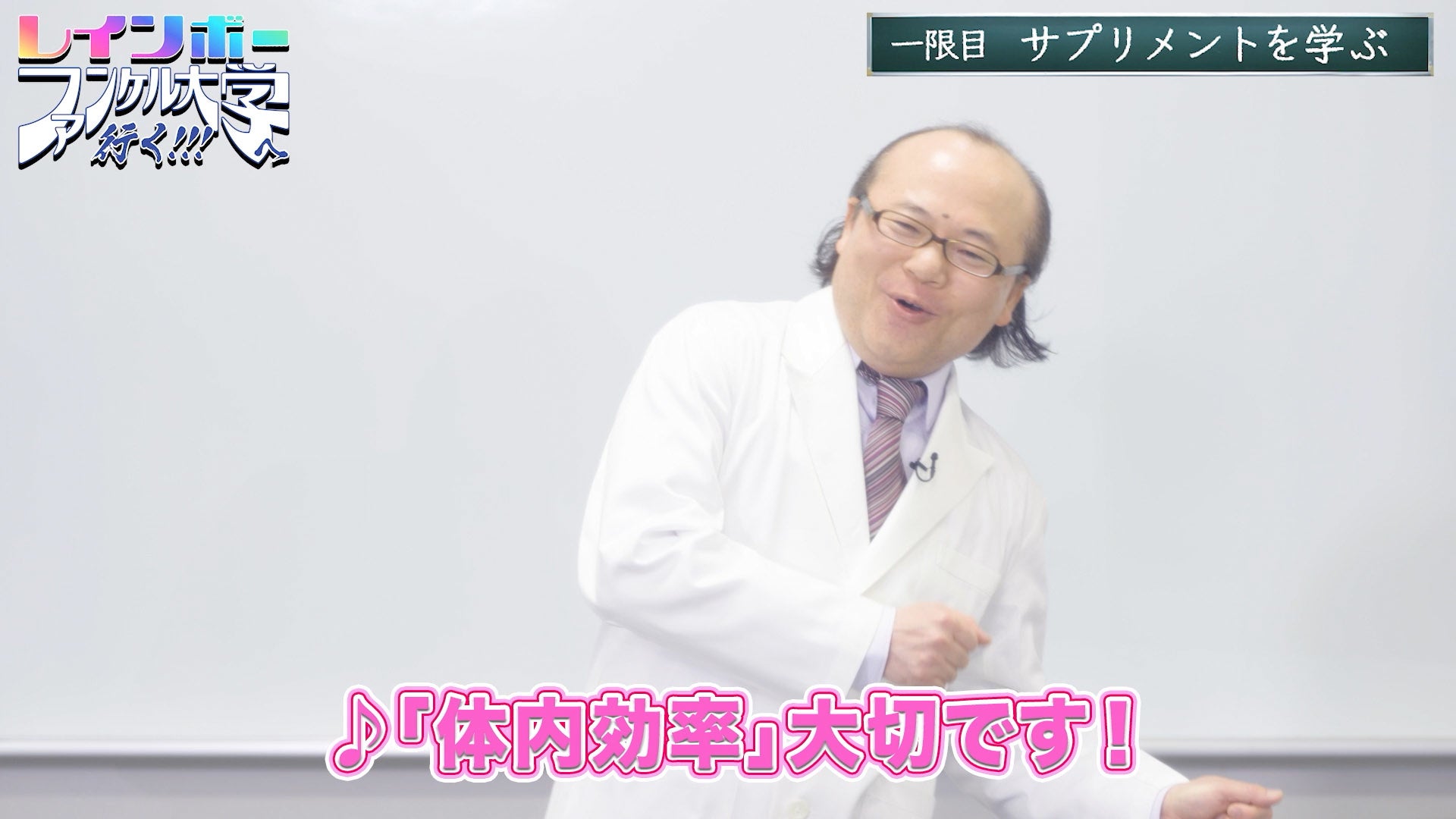 ファンケル大学とは、従業員の人材育成を目的とした学びの場。そのオープンキャンパスに訪れたひやまくん(ジャンボたかお)とみゆきさん(池田直人)が、「超個性的な講師陣」から「そこまでやります」な特別講義を体験!今回は一限目を公開。テーマは「サプリメントを学ぶ」で、ファンケルの大人気製品「内脂サポート」に隠された“体内効率”のヒミツについて、実験を通して楽しく学んでいただきました。