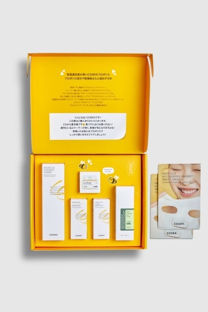 今回のYouTubeコラボ記念BOXは、乾燥肌の方におすすめのPROPOLIS エキスをたっぷり配合したプロポリストーナーとアンプルなど、「COSRX」の人気商品が全5点入ったスペシャルな内容です。同BOXをご購入いただいた方全員にPROPOLIS シートマスクを2枚プレゼントいたします。