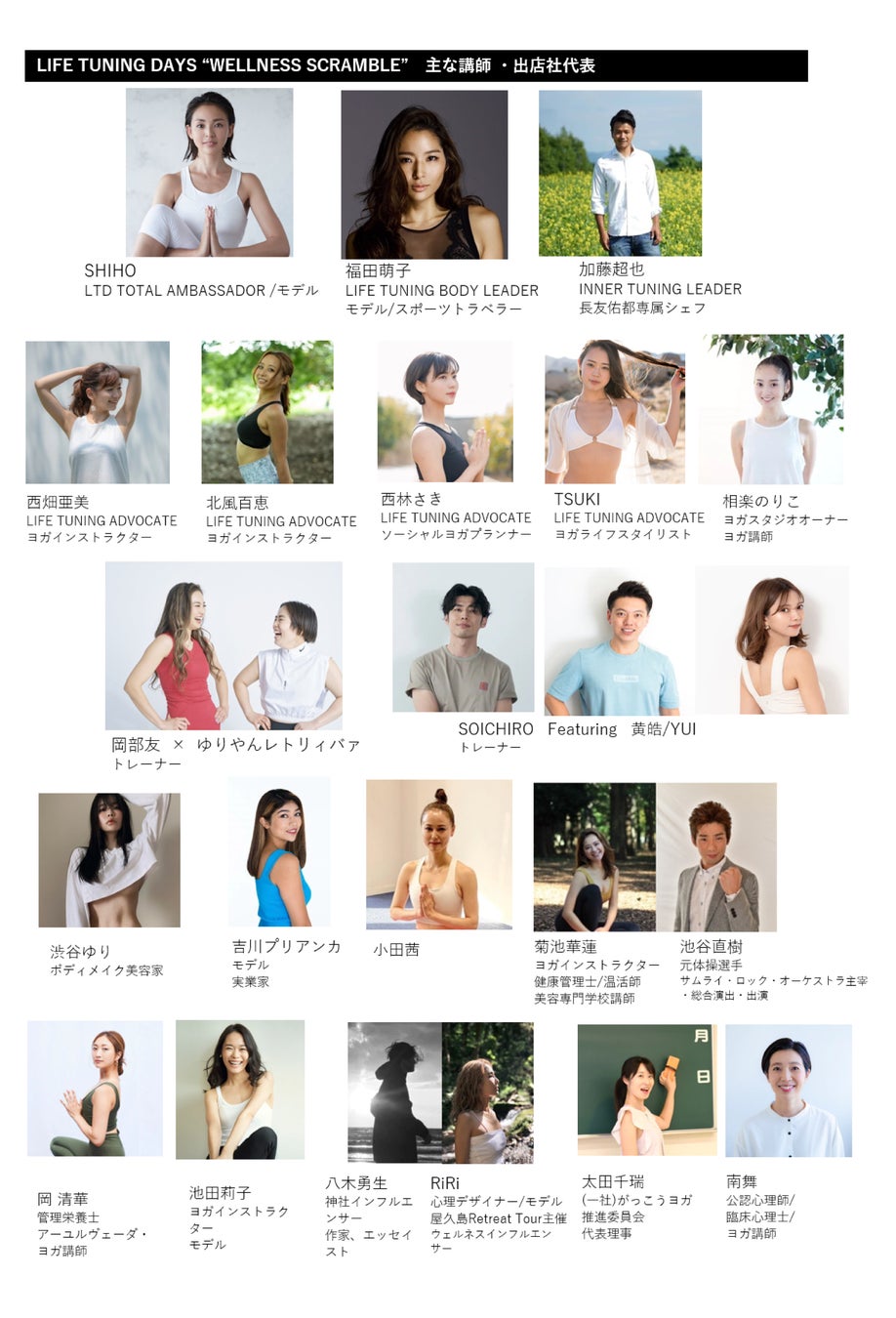 髙橋荘吉(LIFE TUNING DAYS 制作委員会 株式会社B-connect CEO/ファウンダー)「この国の健康寿命を0.5歳上げる」ことが我々の夢です。ヨガをはじめとするあらゆるウエルネスをもっと多くの人に知ってもらいたい。その想いではじまったLIFE TUNING DAYSは、立ち上げ当初の2020年から新型コロナウイルスの影響を受けながらも様々なイベントやライブ配信をはじめ、たくさんのことにチャレンジして参りました。リアル開催が思うようにできなかったことで、逆にたくさんの発見や経験、繋がりを手に入れることもできましたが、それでもやはり、リアルの重要さを改めて実感しています。今回、渋谷ストリームにて念願のリアル&オンラインのハイブリッドイベントを開催できることに大きな喜びを噛み締めながら、心と身体を整える様々なウエルネスと参加される方々との幸せな出会いが生まれる2日間にしたいと思い、全力で取り組んで参ります。ご期待ください。