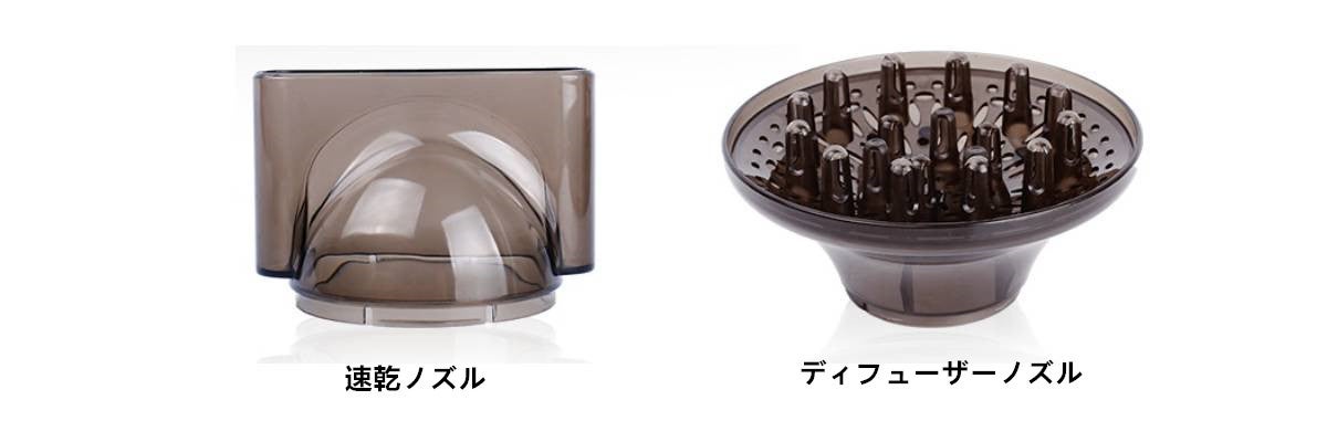 当社のヘアードライヤーに付属しているノズルには、「速乾ノズル」「ディフューザーノズル」の2種類があります。