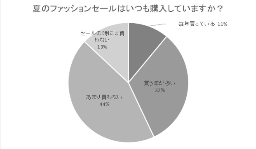 綺和美では、「夏のファッションセールはいつも購入していますか?」というアンケートを行いました。すると、一番多かった回答は「あまり買わない」で44%でした。