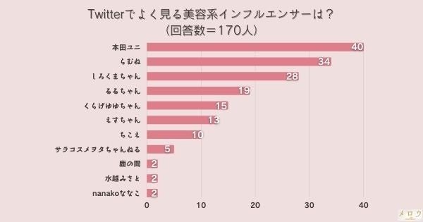 「Twitterでよく見る美容系インフルエンサーは?」とアンケート調査した結果、1位は『本田ユニ』でした。