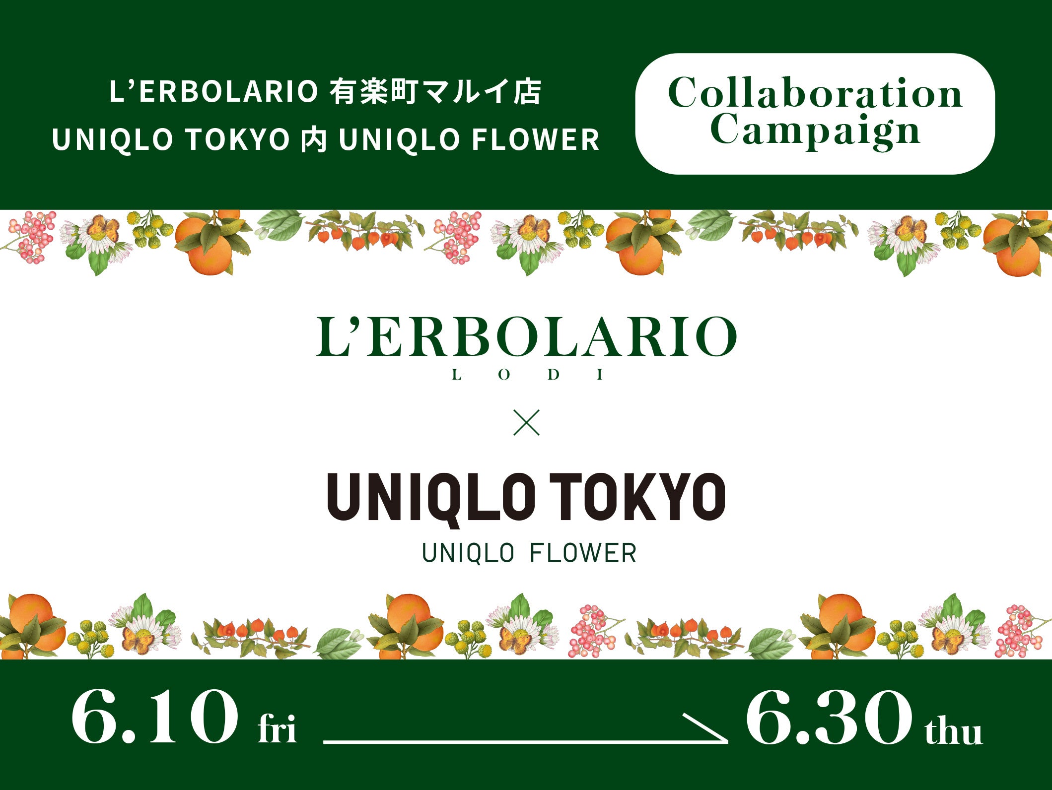 タキヒヨー株式会社(本社:名古屋市西区、代表取締役 社長執行役員:滝 一夫)が展開する、イタリア発の香るナチュラルビューティー『L’ERBOLARIO(レルボラリオ)』は、6月19日(日)に2周年を迎えるUNIQLO TOKYO内 UNIQLO FLOWERと共同で、6月10日(金)から6月30日(木)の間に対象店舗でお買い物をしてくださったお客様にギフトを差し上げるキャンペーンを実施いたします。