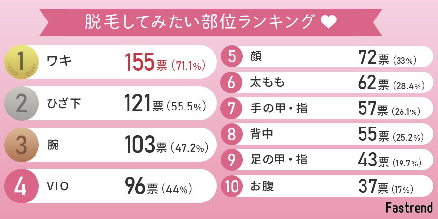 219人中155票で71.1%と多くの方が、「ワキ」の脱毛をしてみたいと思っているようです。