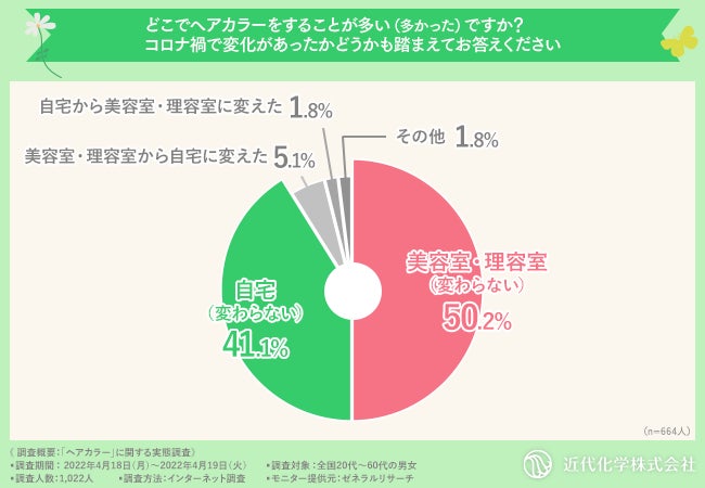 「どこでヘアカラーをすることが多い(多かった)ですか?コロナ禍で変化があったかどうかも踏まえてお答えください」と質問したところ、『美容室・理容室(変わらない)(50.2%)』と回答した方が最も多く、次いで『自宅(変わらない)(41.1%)』と続きました。