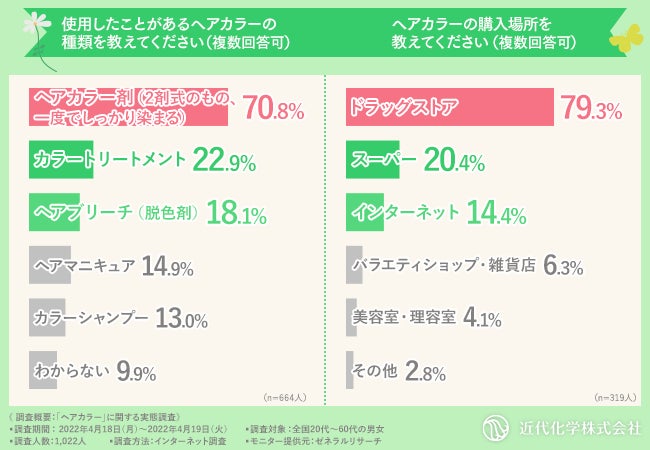 そこで「ヘアカラーの購入場所を教えてください(複数回答可)」と質問したところ、『ドラッグストア(79.3%)』と回答した方が最も多く、次いで『スーパー(20.4%)』『インターネット(14.4%)』と続きました。