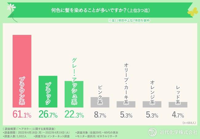 そこで、「何色に髪を染めることが多いですか?(上位3つ迄)」と質問したところ、『ブラウン系(61.1%)』と回答した方が最も多く、次いで『ブラック(26.7%)』『グレー・アッシュ系(22.3%)』と続きました。