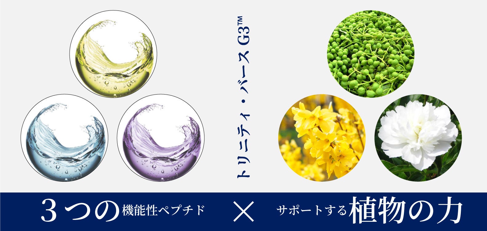 先進の機能性保湿成分【トリニティ・バースG3】はミリストイルペンタペプチドー17を筆頭に3種のペプチドを配合。それぞれに補完し合う3種の植物エキスがトリニティ効果をもたらします。防腐剤フリーのビーガン処方、副作用のない低刺激性も特徴です。