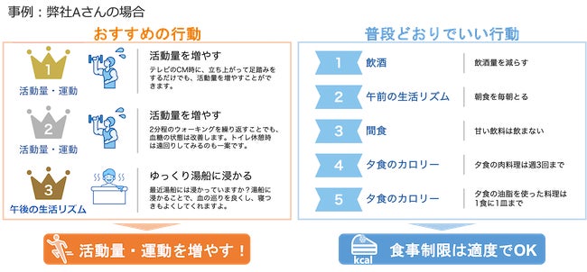 当サービスは、従業員の健康経営に取り組む企業様をはじめ、フィットネスジムやエステサロン、健診クリニック等、ユーザーの減量支援に取り組む機関に向けた企業向けサービスです。各機関を通して採取したユーザーの便から、腸内環境情報を取得し、アンケートや健康診断データも合わせて痩せるAIにより解析します。そのユーザーの健康維持を目的として痩せるために適した行動を「おすすめの行動」とし、その逆に痩せることにあまり寄与しない行動を「普段通りでいい行動」と定義し、それぞれをランキング化してフィードバックいたします。
