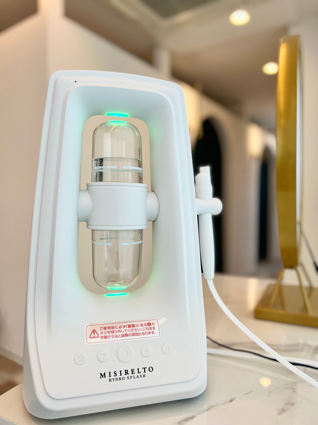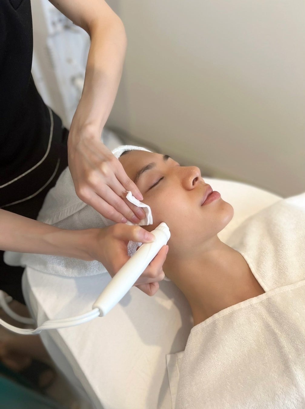 水素を発生させた水をお肌に高速で噴射、それと同時に吸引することにより、通常のクレンジングでは取れない頑固な汚れにアプローチできます。クレンジング成分を使わないのでお肌が弱い方でも安心して使用いただけます。肌の黒ずみや臭いの元になる汚れなどがごっそりボトルに溜まるので、お客様に施術の効果をしっかり確認していただけます。