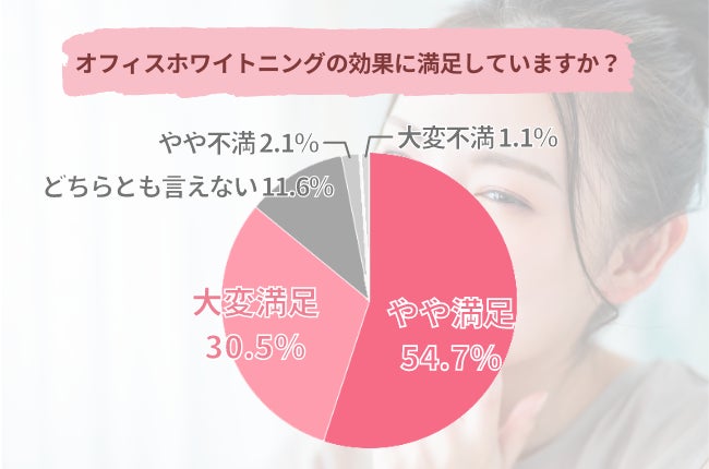 「オフィスホワイトニングの効果に満足していますか?」と質問したところ、『やや満足(54.7%)』『大変満足(30.5%)』『どちらとも言えない(11.6%)』『やや不満(2.1%)』『大変不満(1.1%)』といった回答結果となりました。