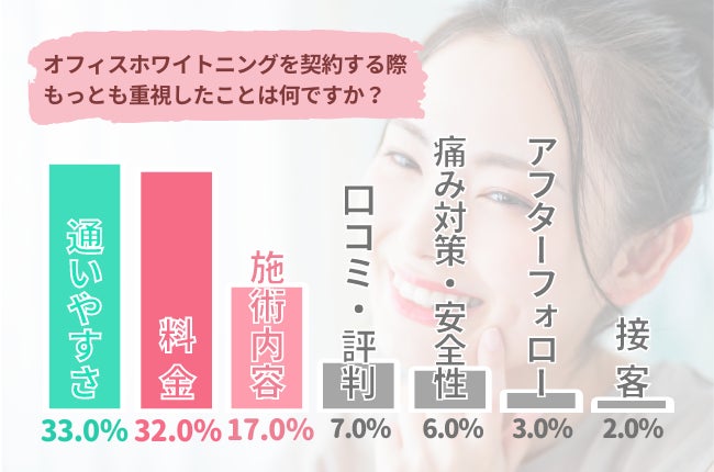 「オフィスホワイトニングを契約する際に、もっとも重視したことは何ですか?」と質問したところ、『通いやすさ(33.0%)』『料金(32.0%)』との回答が続き、両者を合わせると全体の半数以上を占める結果に。