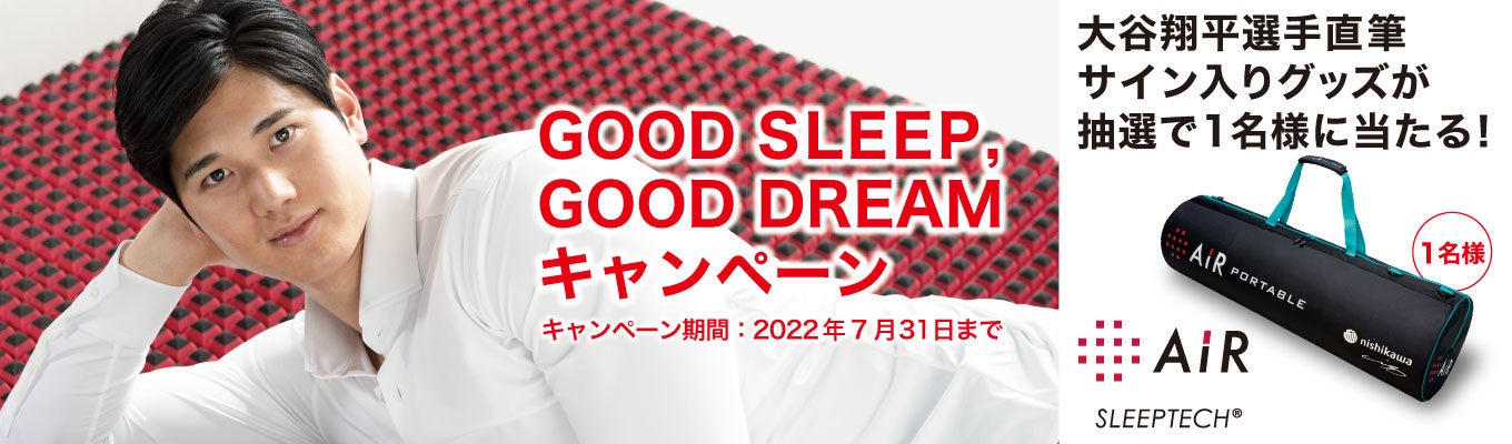 このたびの「GOOD SLEEP, GOOD DREAM キャンペーン」は、大谷選手に愛用いただいている[エアーSX]マットレスをはじめ、[エアー]のマットレス全5種類を対象に実施します。期間中、対象商品をご購入の上、ご応募いただいた方の中から抽選で1名様に大谷選手直筆サイン入りモバイルマットを、99名様に西川[クイック]スポーツタオルをプレゼントします。また、キャンペーン実施店舗で[エアー]のマットレスを体感いただいた方には、大谷選手オリジナルクリアファイルをプレゼントします。 (※クリアファイルは各店舗数量限定、なくなり次第終了)