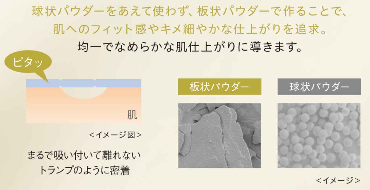 球状パウダーをあえて使わず、板状パウダーを使用することで、粉がお肌にぴたっと密着し化粧くずれしにくい処方設計となっています。