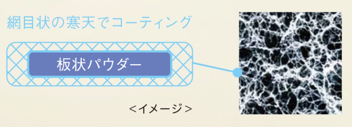 微細な網目構造を持つ寒天で板状パウダーをコーティング。水分を取り込みフィット感がアップ。水分を抱えながら、つけたての美しさを持続します。
