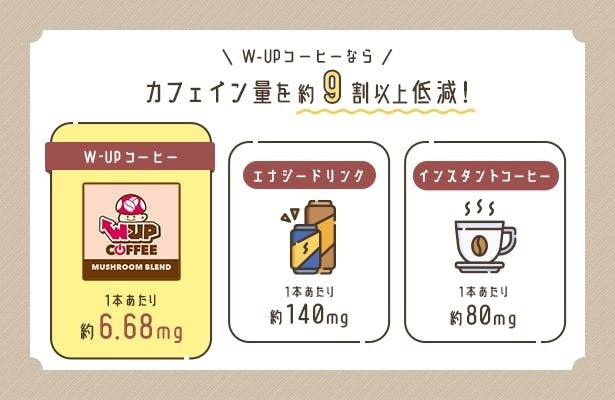 「朝を有効活用するために日本のみなさんにもマッシュルームコーヒーを試してほしい」という想いで、日本人でも飲みやすいマッシュルームコーヒー「W-UP コーヒー」を開発しました。
