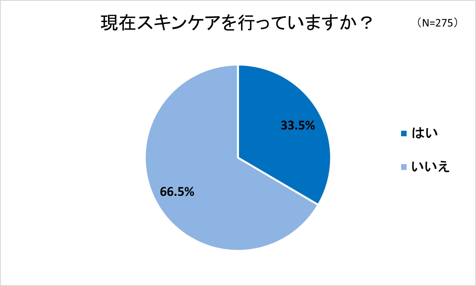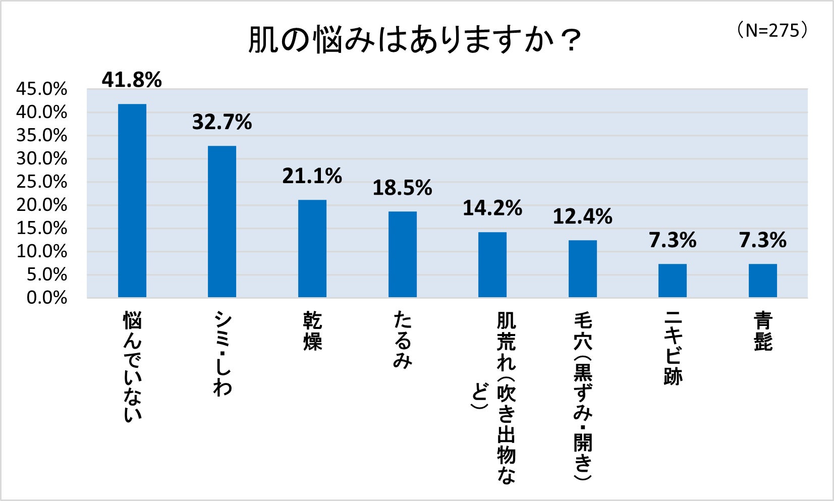 また、肌の悩みに関しても同じく約6割の人がなんらかの悩みを抱えており、最も多いのは「シミ」で32%という結果になりました。頭皮・頭髪ケアと同じく、スキンケアをしている人は約3割しかおらず、悩んでいてもケアはできていないという現状がわかりました。
