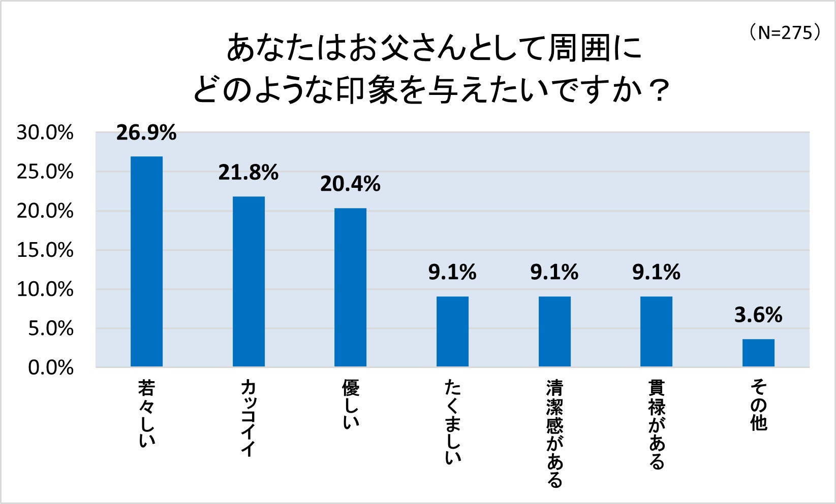 周囲の人にどのような印象を与えたいですか?という問いに対して「若々しい」と回答した人が最も多い結果になりました。入学式や参観日、運動会、部活動など学校の行事では親も横並びになることも多いため、気にする人が多いのでしょうか。いつまでも家族の自慢の“お父さん”でありたいという気持ちが強いようです。