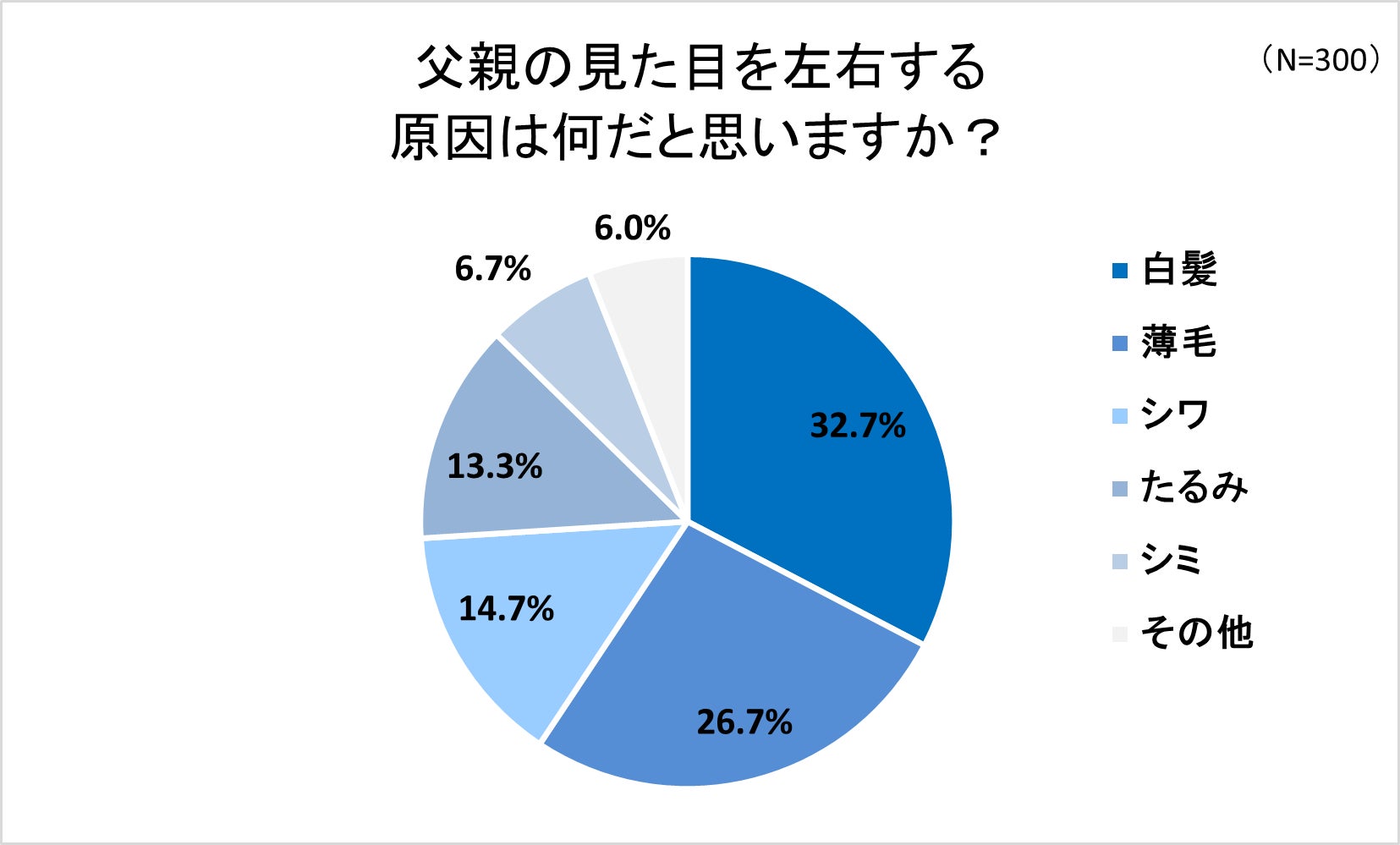 父親の理想像として最も多かったのは「穏やか」で約3割、次いで「若々しく元気」が2割という結果になりました。また、父親の見た目年齢を左右するのは「薄毛」が最も多く、次いで「白髪」となっており、コロナ禍におけるマスク生活もあるからか、頭髪で大きく印象が変わると考えているようです。