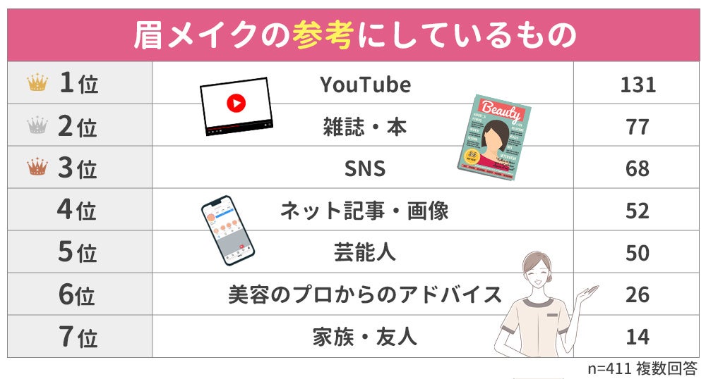 全国の10代以上の女性500人に「眉メイクで参考にしているもの」を聞いたところ、1位は「YouTube(131人)」でした。