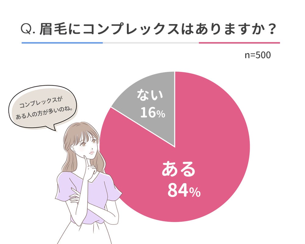 全国の10代以上の女性500人に「眉毛にコンプレックスがあるか」を聞いたところ、「ある」と答えた人が84.0%で、「ない」を大きく上回りました。