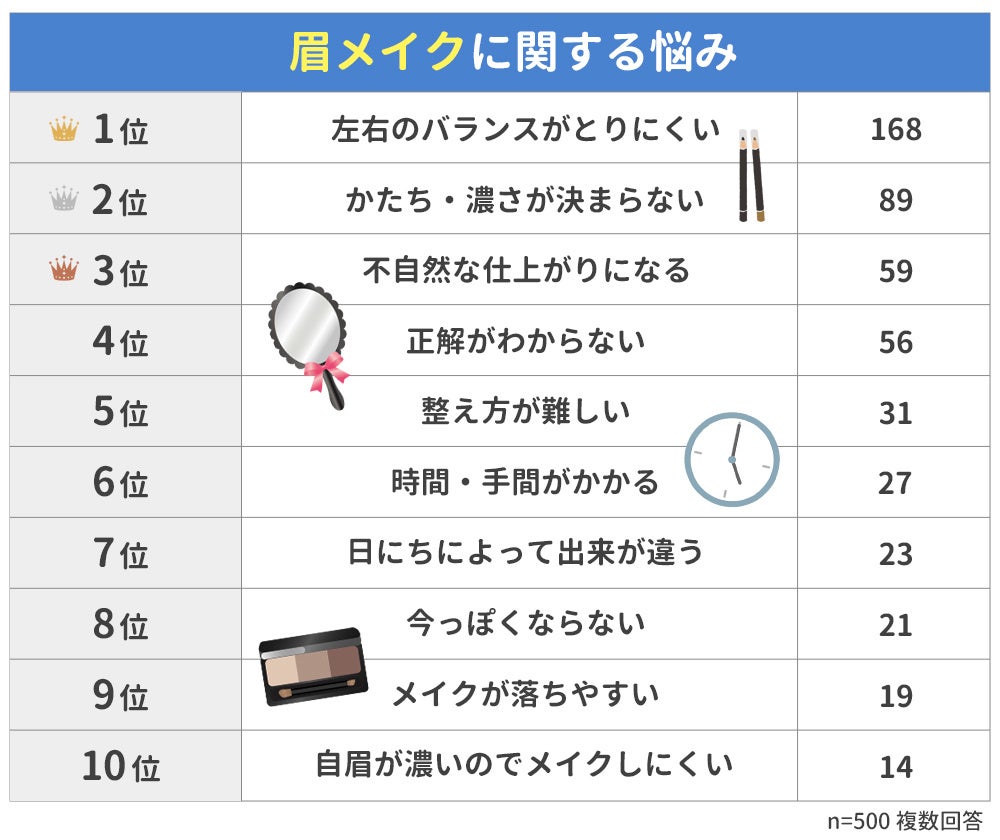 全国の10代以上の女性500人に「眉メイクの悩み」を聞いたところ、1位は「左右のバランスがとりにくい(168人)」でした。
