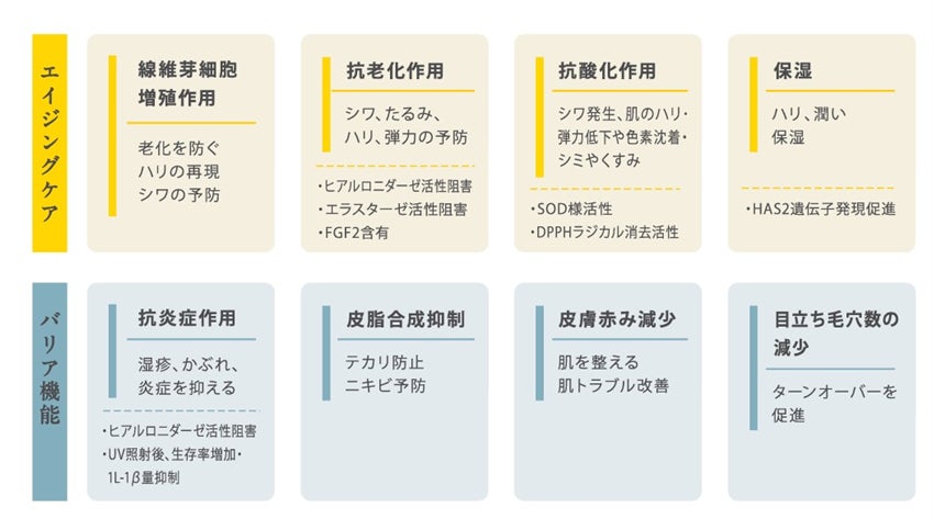 ※3:『CELLAMENT(セラメント)』の主成分である「ニワトリ卵胚体外膜細胞順化培養液」が、線維芽細胞の増殖促進効果、バリア機能向上(セラミド合成促進と分解抑制、フィラグリン産生促進、ヒアルロン酸合成促進に関する遺伝子発現量の上昇による)、紫外線ダメージに対する角化細胞の保護・抗炎症作用、細胞外マトリクス(ECM)合成促進・分解抑制作用、抗酸化作用、皮脂合成抑制作用、美白(メラニン産生抑制)などの機能を有することを各種試験で確認。(フレグランスジャーナル社『FRAGRANCE JOURNAL』2021年6月号 p74~p79)