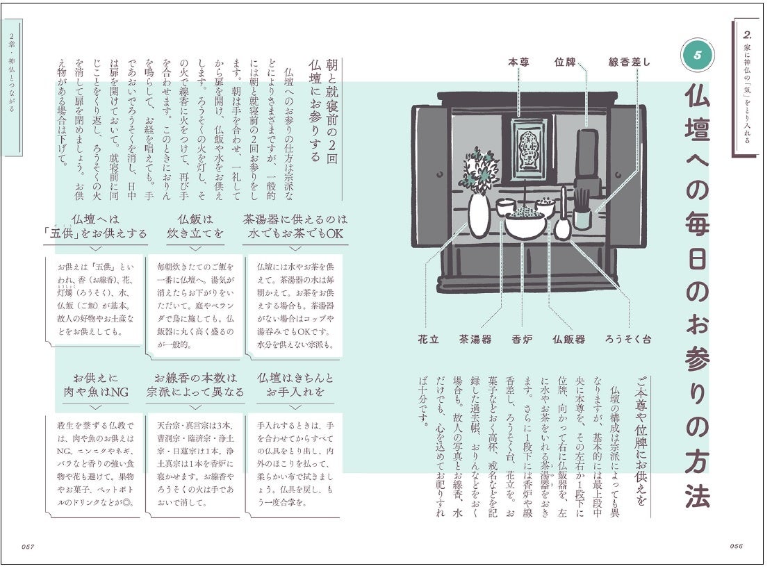 まずは神仏からさらなる守護を得る方法として、神社の参拝の仕方や、お墓参りの作法、家で仏壇や神棚を祀る方法をおさらい。意外と知らない、神社の参道の歩き方、絵馬の書き方、おみくじの引きかたやお守りの返し方を学んで、神様との縁を深めて。吉方位の神社参りやお水取りについても詳しく解説。毎日の神棚や仏壇へのお供えの方法も。日々の生活の中に、神仏の気を取り入れましょう。