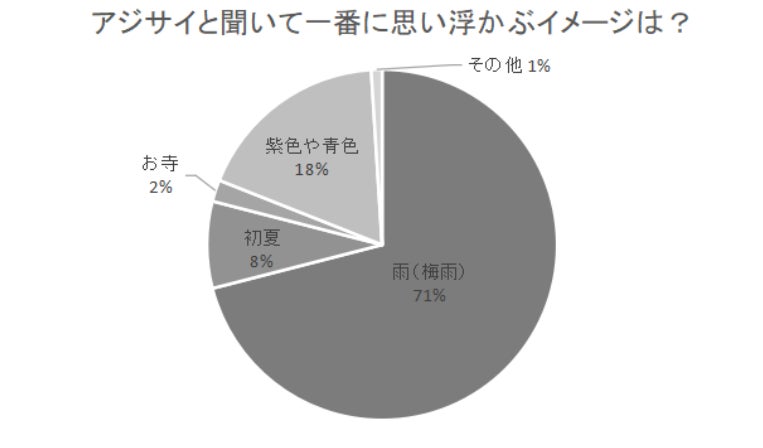 アジサイはさまざまな顔を持っています。そこで、「アジサイと聞いて一番に思い浮かぶイメージは?」という質問も行いました。すると、一番多かった回答は、「雨(梅雨)」で71%でした。