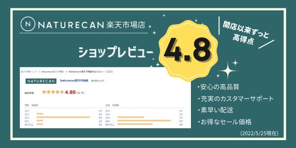 Naturecan楽天市場店では、お客さまからのショップレビュー4.8点以上をずっと維持しています。充実したカスタマーサポートにて、製品の使用方法や配送についての質問をお受けしております。ご不明な点がございましたらお気軽に店舗お問合せ窓口からお問合せくださいませ。Naturecanの公式店舗ですので、皆さまに安心してご利用いただけます。