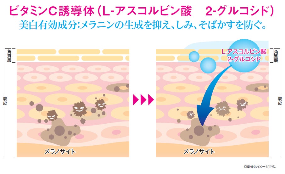 有効成分の弱酸性安定型ビタミンC誘導体(L-アスコルビン酸 2-グルコシド)がメラニンの生成を抑え、シミ・そばかすを防ぎます。