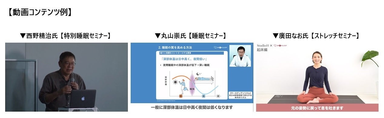 『スタンフォード式 最高の睡眠』の著者であり、ブレインスリープ最高研究顧問の西野精治をはじめとした睡眠医学の専門家の「睡眠知識動画」、運動/呼吸/メディテーション(瞑想)など、各界のプロフェッショナルが睡眠改善メソッドをお伝えする「睡眠サポート動画」のセットや医師が監修した「睡眠アドバイス」の記事の提供など、各従業員が自身の睡眠を改善するヒントを多方面より提案します。