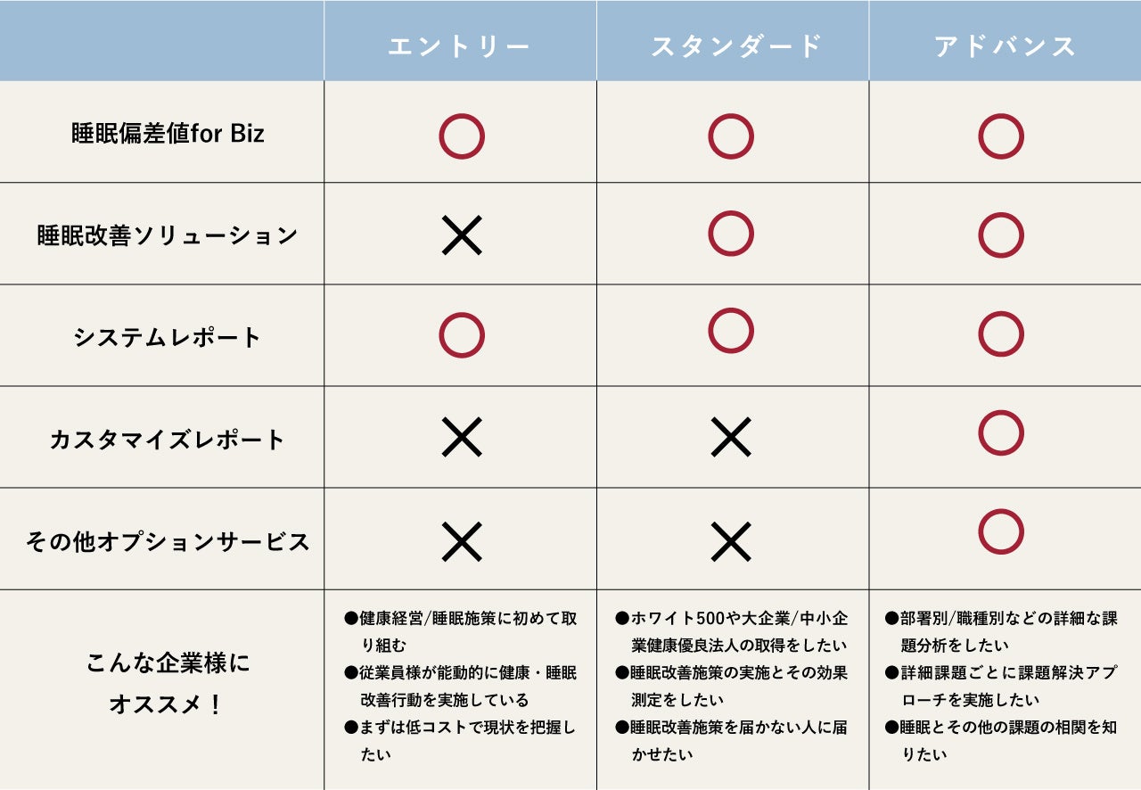 健康経営や睡眠施策に初めて取り組む企業から、他の健康経営施策と合わせた分析を行い、課題解決に取り組みたい企業まで、企業課題に合わせたプランを開発いたしました。