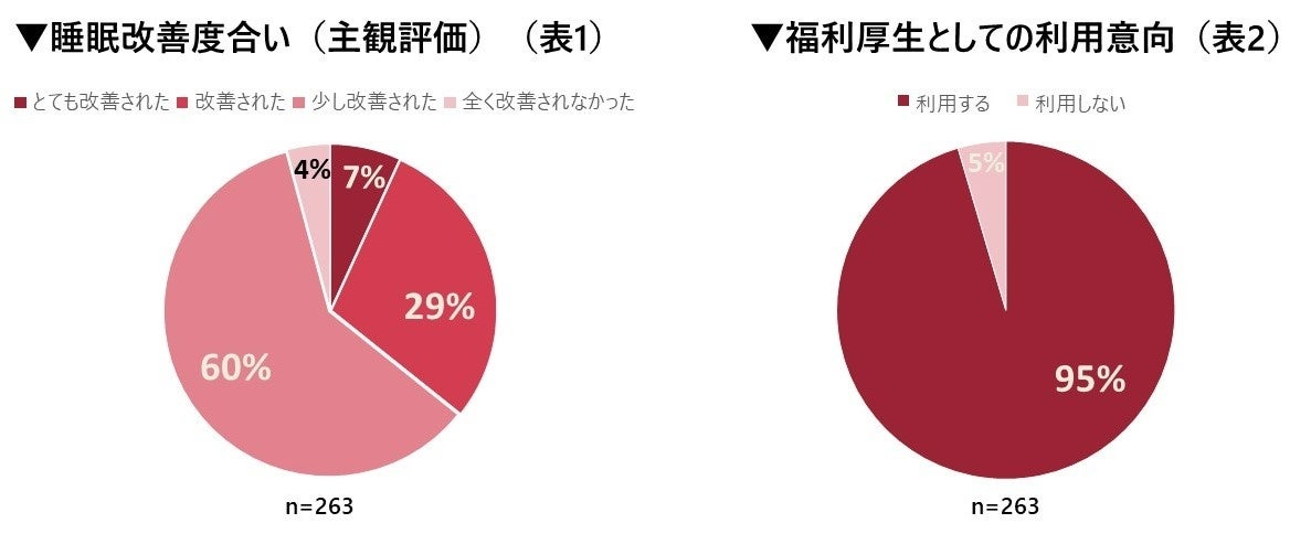 また、検証終了後のアンケート(n=263)では、「再度睡眠のトライアルを開催したら参加する」と回答した人は全回答者263名中251名と95.4%が再度の参加意向を示しました(表1)。また、今回のトライアルで自身の睡眠が「とても改善された」、「改善された」と回答した人は計35.7%、「少し改善された」と回答した人を含めると95.8%に上りました(表2)。