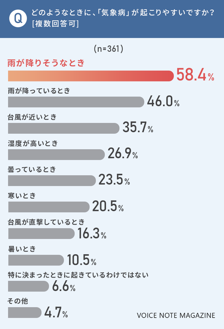 半数以上の方が「雨が降りそうなとき」に起きやすいようです。